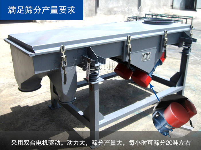 直線振動篩采用雙臺電機驅動,動力大,篩分產量大,由于篩箱的振動,篩上物料層被松散,使大顆粒本來就存在的間隙被進一步擴大,小顆粒乘機穿過間隙,大的篩分產量每小時可篩分20噸左右,而元明粉篩分產量要求在8噸/時,可以達到元明粉產量的要求。