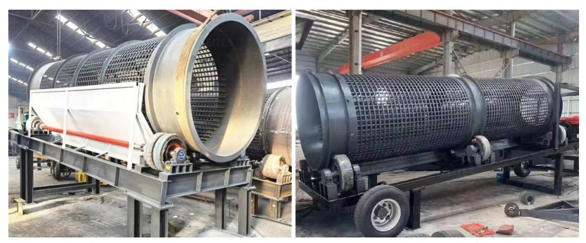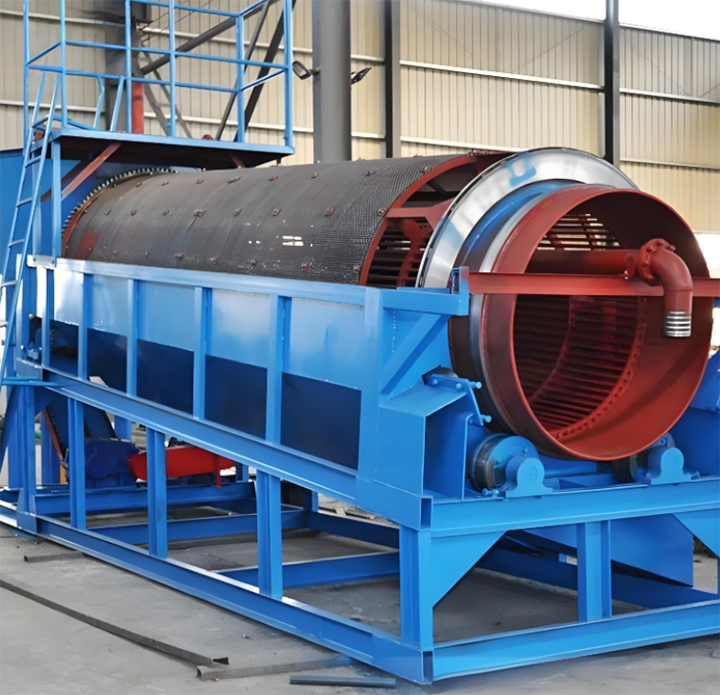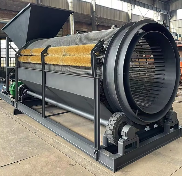 當(dāng)其啟動(dòng)時(shí),電動(dòng)機(jī)經(jīng)減速器與滾筒裝置通過(guò)聯(lián)軸器連接在一起,驅(qū)動(dòng)滾筒裝置繞其軸線轉(zhuǎn)動(dòng)。當(dāng)物料進(jìn)入滾筒裝置后,由于滾筒裝置的傾斜與轉(zhuǎn)動(dòng),使篩面上的物料翻轉(zhuǎn)與滾動(dòng)的同時(shí),自上而下通過(guò)分級(jí)篩網(wǎng)析出,由于篩網(wǎng)規(guī)格不同,物料直接被分離篩選,合格物料(篩下物)經(jīng)滾筒外圓的篩網(wǎng)排出,不合格的物料(篩上物))經(jīng)滾筒末端排出。由于物料在滾筒內(nèi)的翻轉(zhuǎn)、滾動(dòng),使卡在篩孔中的物料被彈出,可防止篩孔堵塞。